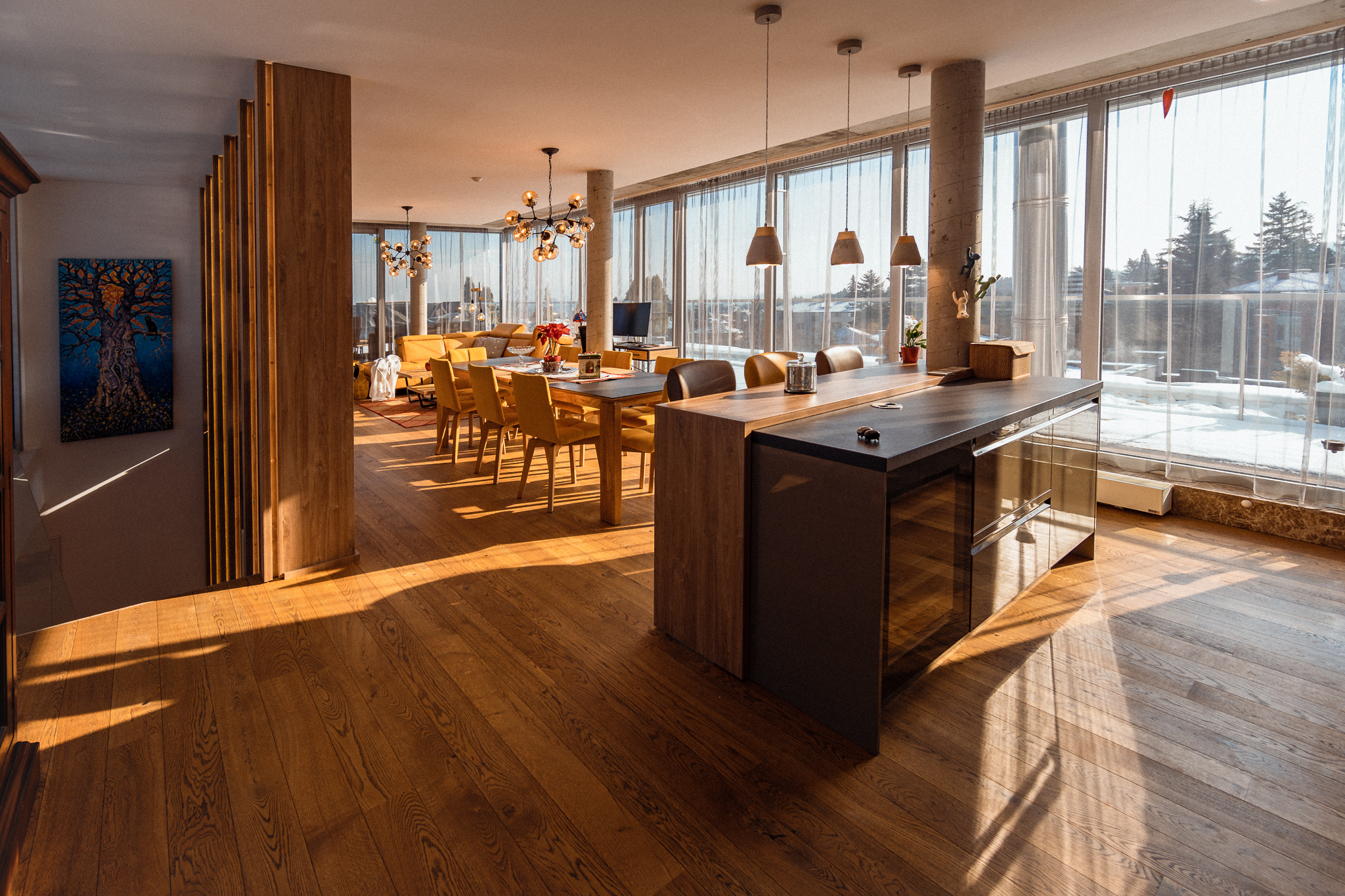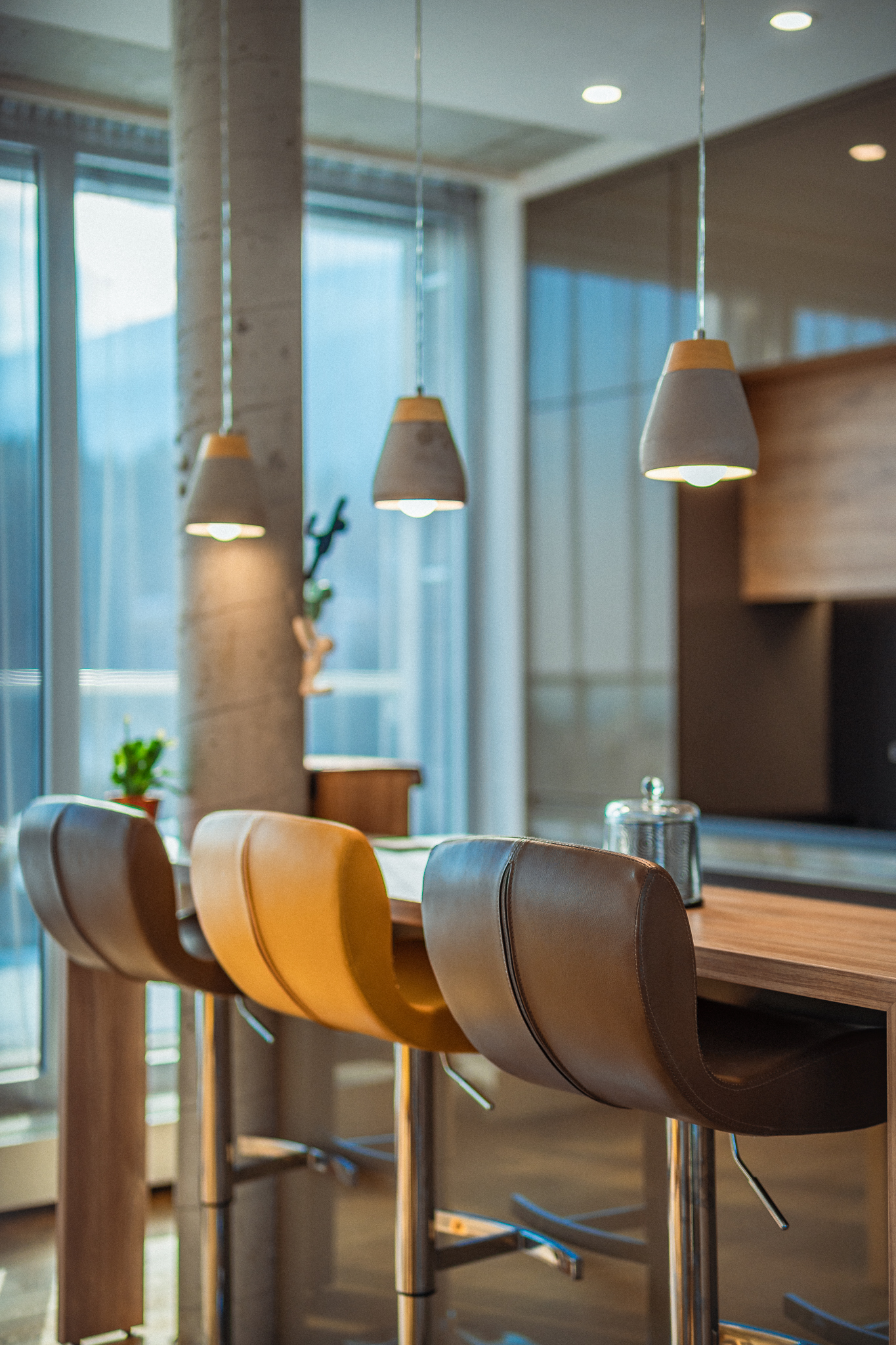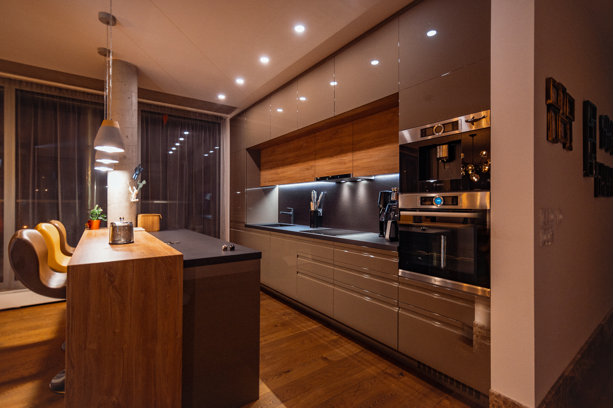 Домът е мястото, което разкрива кои сме. А този дом е точно каквито са обитателите му – слънчев, приветлив и широко скроен. За холът заложихме на отворена схема, акцентираща на естествената светлина, влизаща в помещението от три посоки. Поради факта, че този имот е почти напълно лишен от стени, заложихме на ярки жълти тонове в меката мебел, които гласно да заявят – жилище а не витрина. Успокоихме темпото с основа от тъмен дъб с рустикални елементи, подхождайки с информацията, че клиента ни има богат набор от лични вещи със сантиментална стойност, които трябва да вградим в интериора, създавайки амалгама от модерни свежи тонове и непреходни елементи от миналото. Фонът на помещението е именно кухнята, която със своята модерна изчистена визия и графитен лак дава база и уют на цялото пространство. Като елемент от архитектурата запазихме колоните от видим бетон, които да кореспондират с лентата от видим бетон по тавана на помещението.