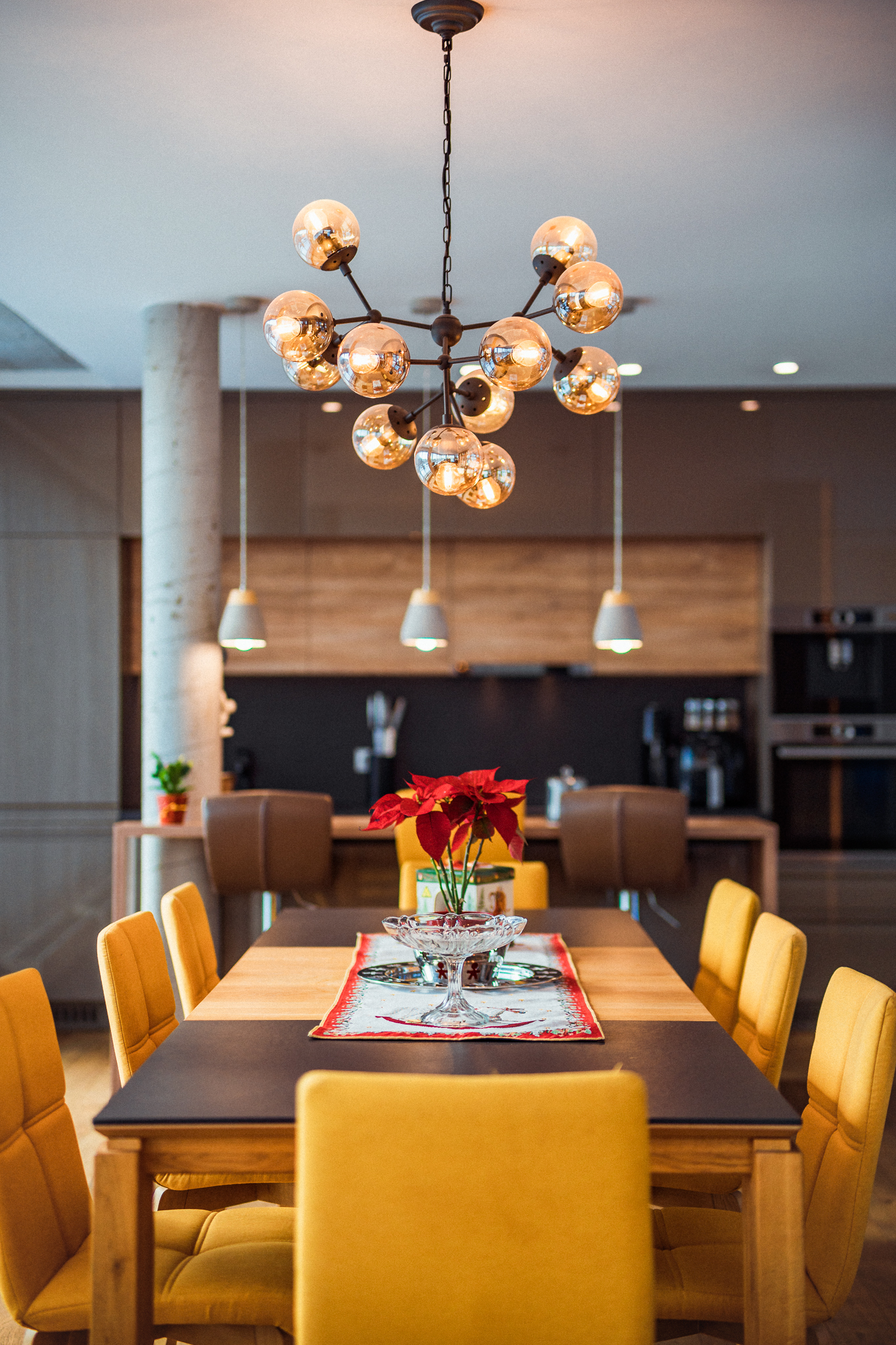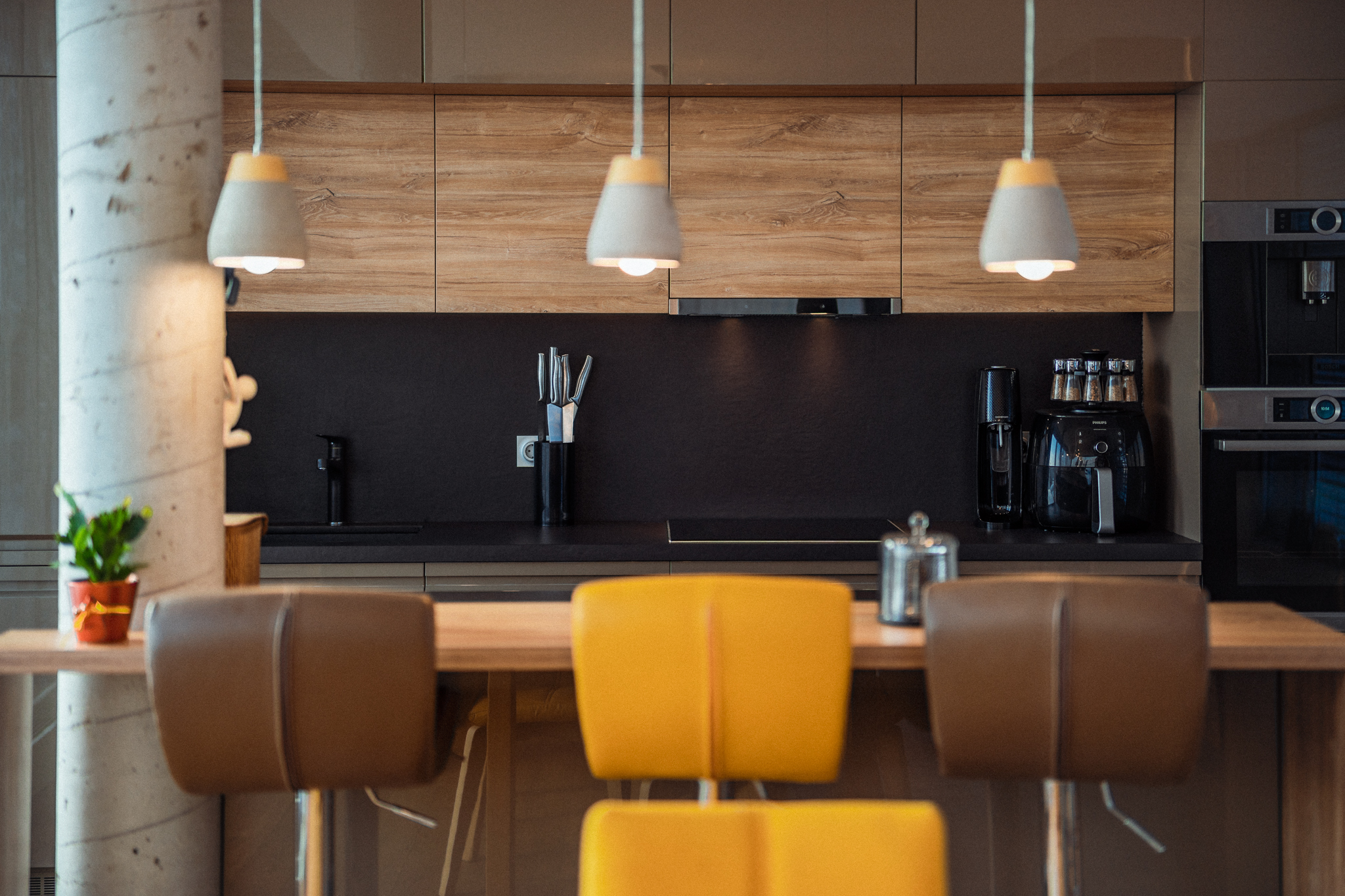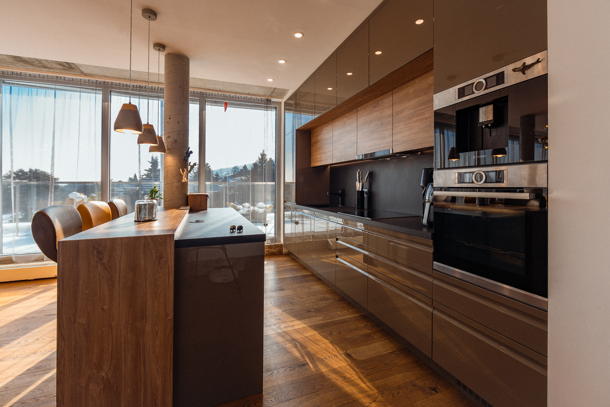Домът е мястото, което разкрива кои сме. А този дом е точно каквито са обитателите му – слънчев, приветлив и широко скроен. За холът заложихме на отворена схема, акцентираща на естествената светлина, влизаща в помещението от три посоки. Поради факта, че този имот е почти напълно лишен от стени, заложихме на ярки жълти тонове в меката мебел, които гласно да заявят – жилище а не витрина. Успокоихме темпото с основа от тъмен дъб с рустикални елементи, подхождайки с информацията, че клиента ни има богат набор от лични вещи със сантиментална стойност, които трябва да вградим в интериора, създавайки амалгама от модерни свежи тонове и непреходни елементи от миналото. Фонът на помещението е именно кухнята, която със своята модерна изчистена визия и графитен лак дава база и уют на цялото пространство. Като елемент от архитектурата запазихме колоните от видим бетон, които да кореспондират с лентата от видим бетон по тавана на помещението.