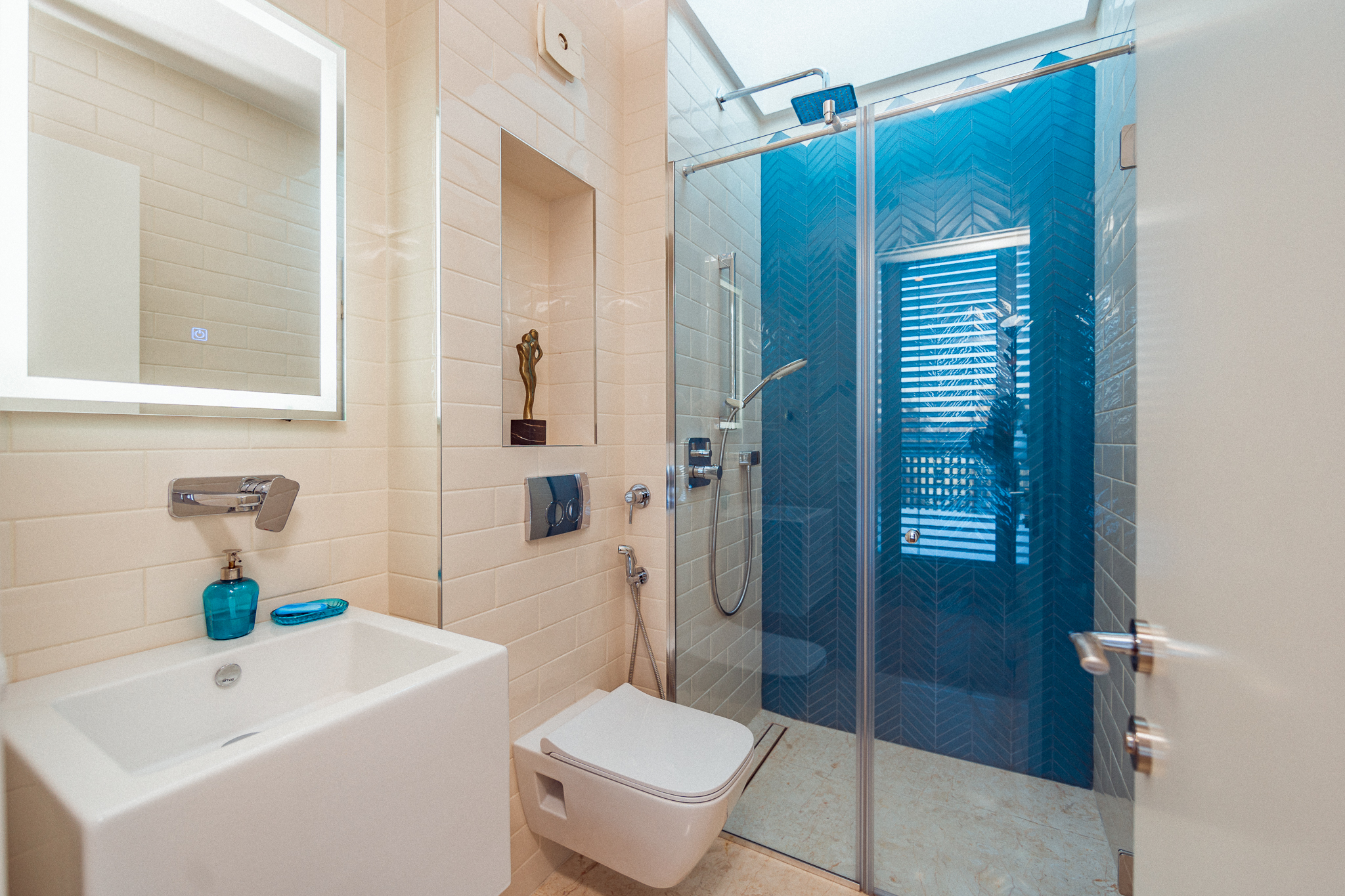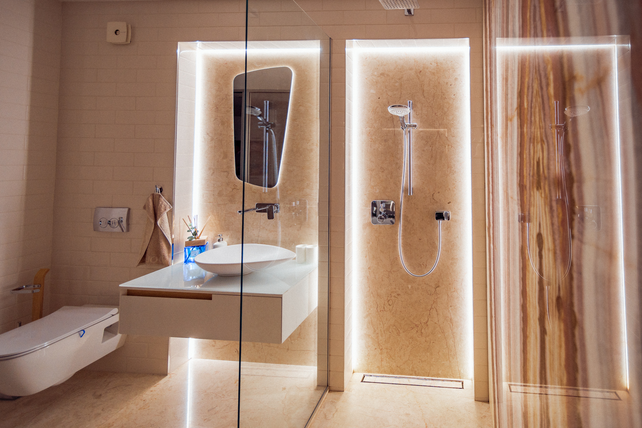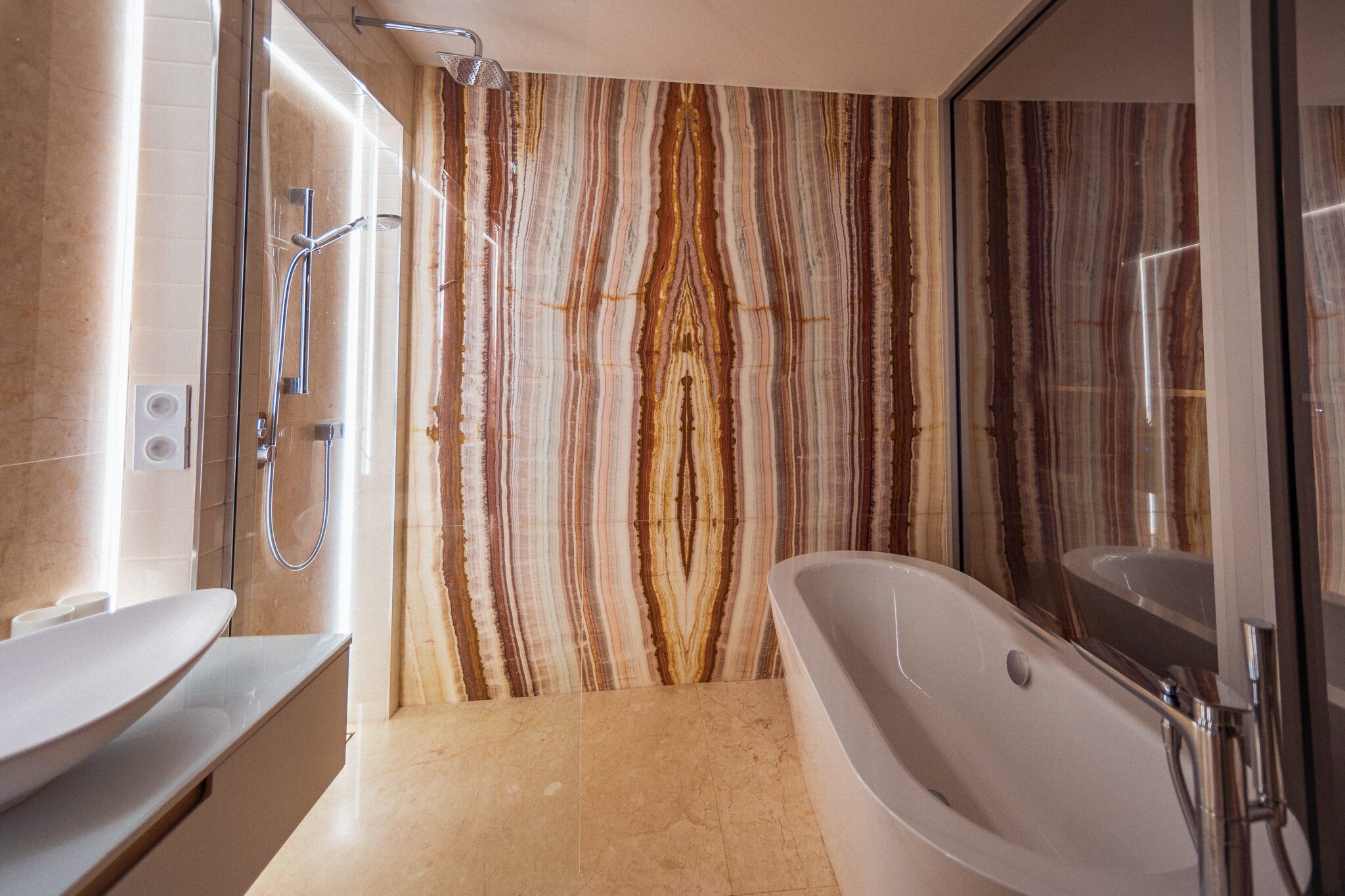 Самите бани за скритата перла в короната на този имот. Акцентът от синьо стъкло в малката баня е поставен така, че да извлича максимална полза от намиращият се над душа оберлихт. Настилката от естествен мрамор с розови жилки дава мекотата на помещението, а белите облицовъчни плочки с изразен фасет – неговата текстура. Аналогични материали са заложени и в главната баня, където разликата е в акцента – огледално полирани фаши от ахат. С безбройните си нишки и слоеве, този камък отразява по фантастичен начин както нахлуващата през френския прозорец дневна светлина от ляво, така и индиректната LED светлина от дясно вечерно време. Създадената сцена не подлежи на описание, за това пък създава запомнящо се изживяване.