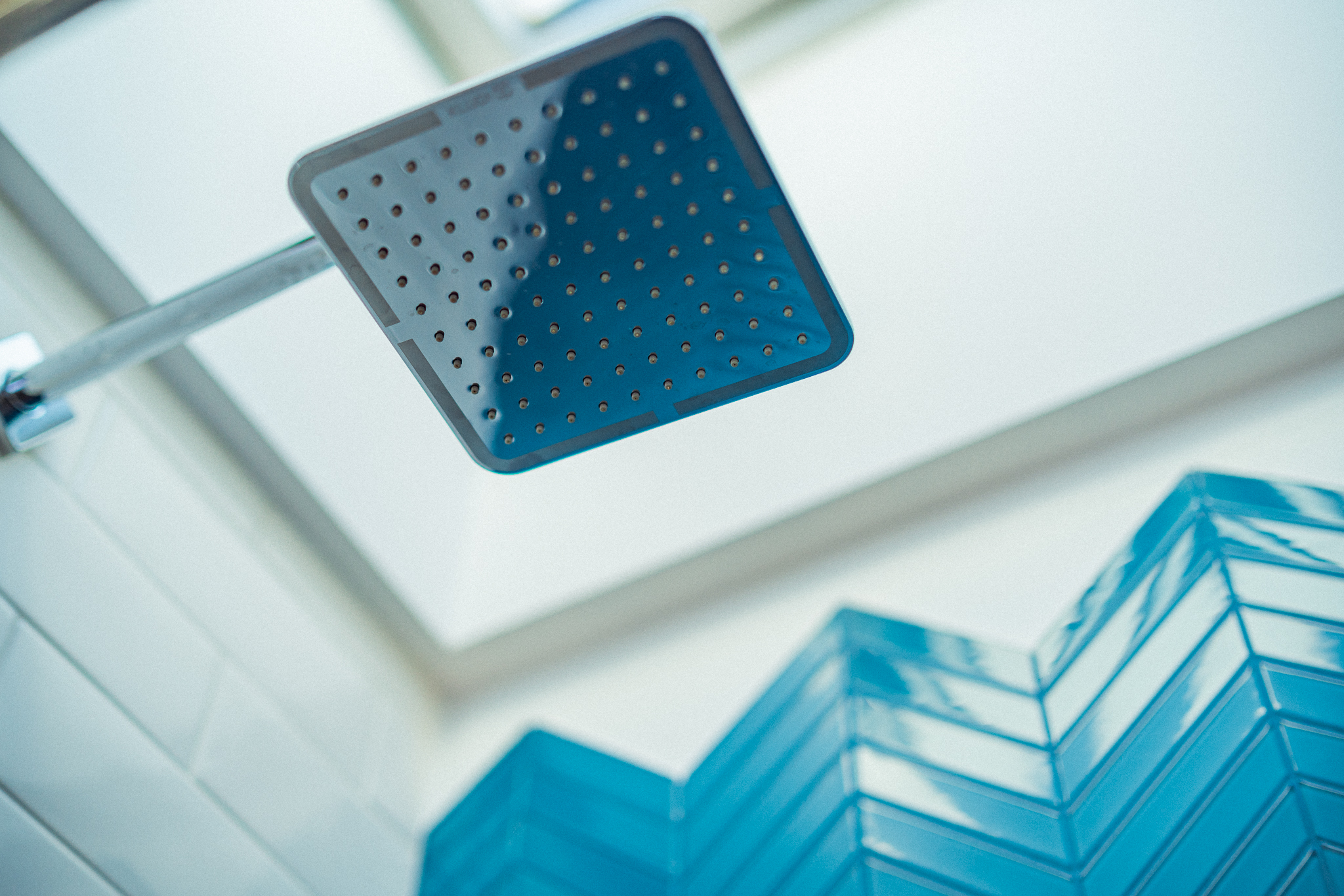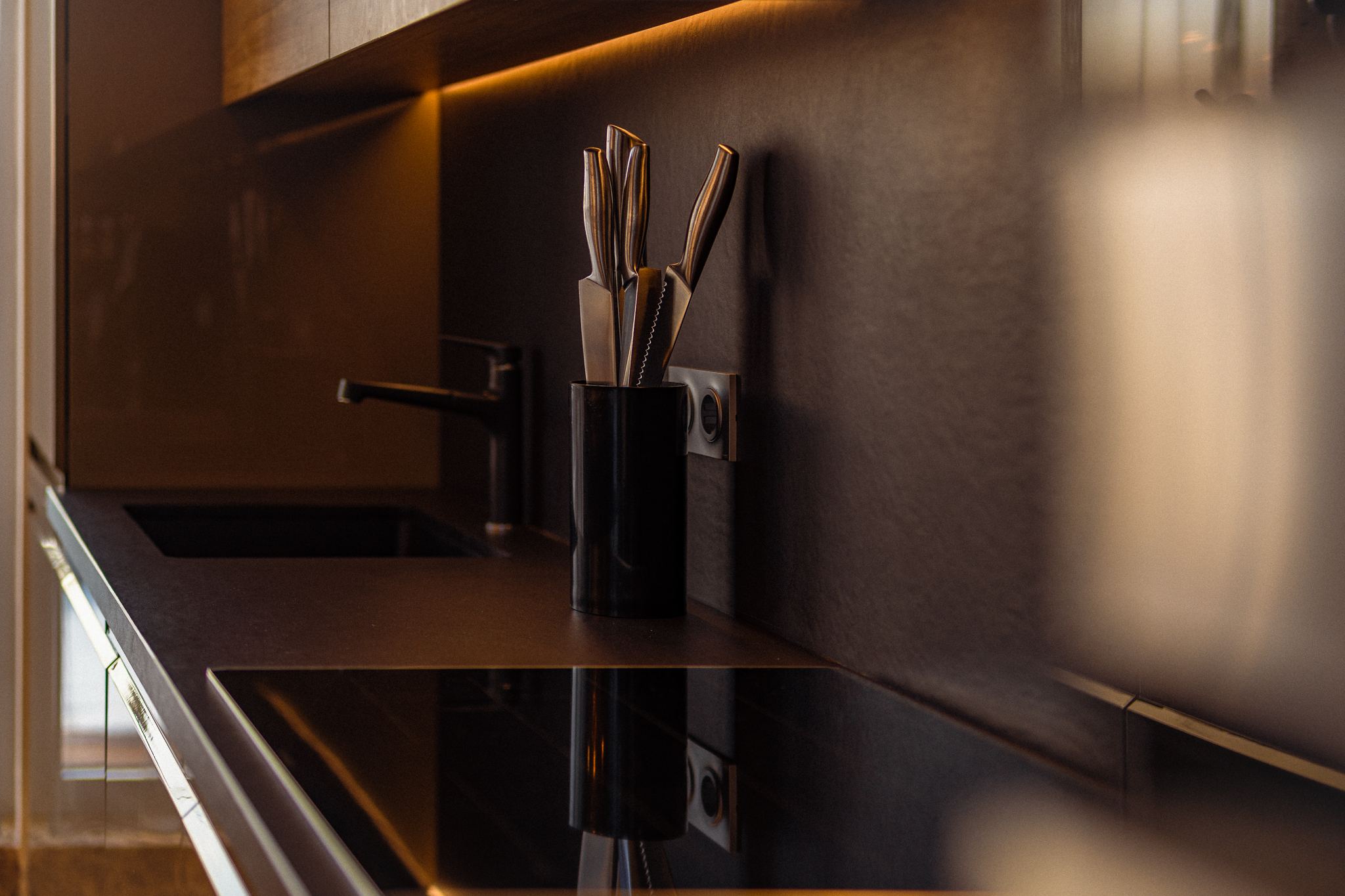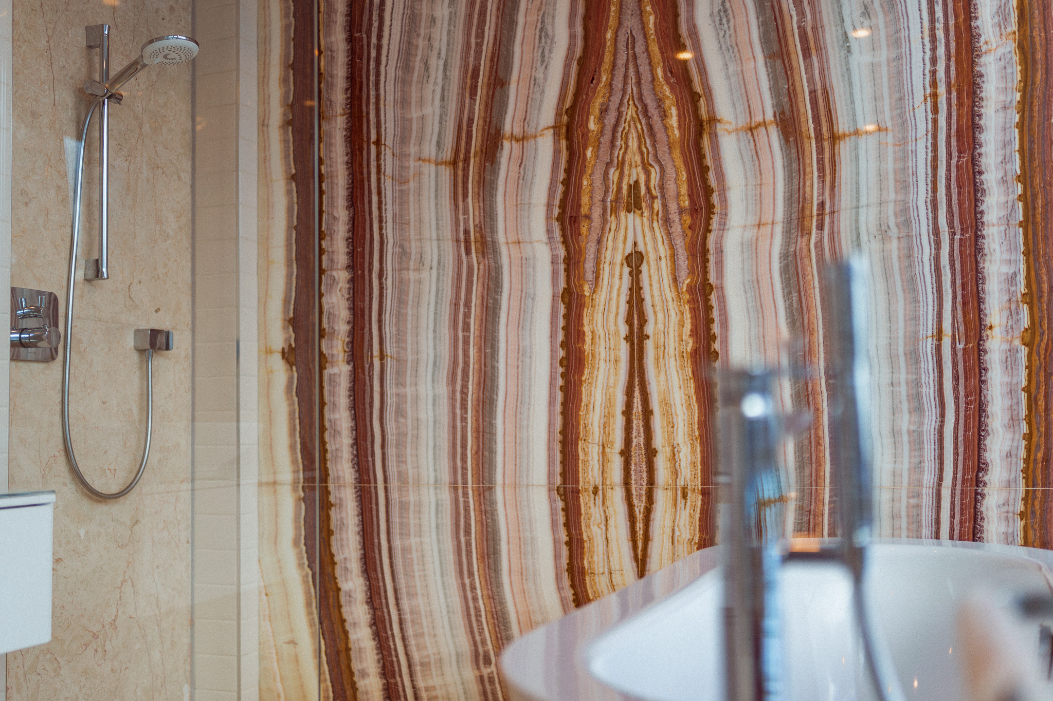Самите бани за скритата перла в короната на този имот. Акцентът от синьо стъкло в малката баня е поставен така, че да извлича максимална полза от намиращият се над душа оберлихт. Настилката от естествен мрамор с розови жилки дава мекотата на помещението, а белите облицовъчни плочки с изразен фасет – неговата текстура. Аналогични материали са заложени и в главната баня, където разликата е в акцента – огледално полирани фаши от ахат. С безбройните си нишки и слоеве, този камък отразява по фантастичен начин както нахлуващата през френския прозорец дневна светлина от ляво, така и индиректната LED светлина от дясно вечерно време. Създадената сцена не подлежи на описание, за това пък създава запомнящо се изживяване.