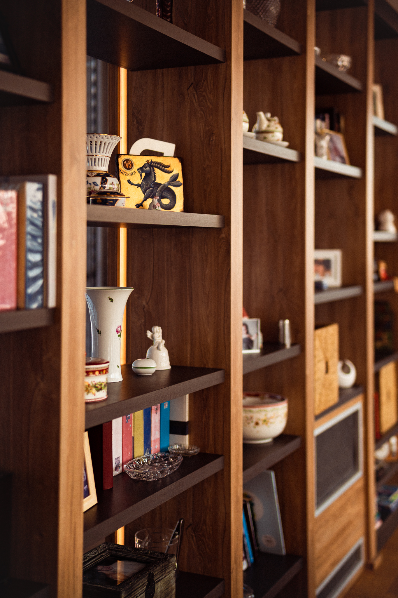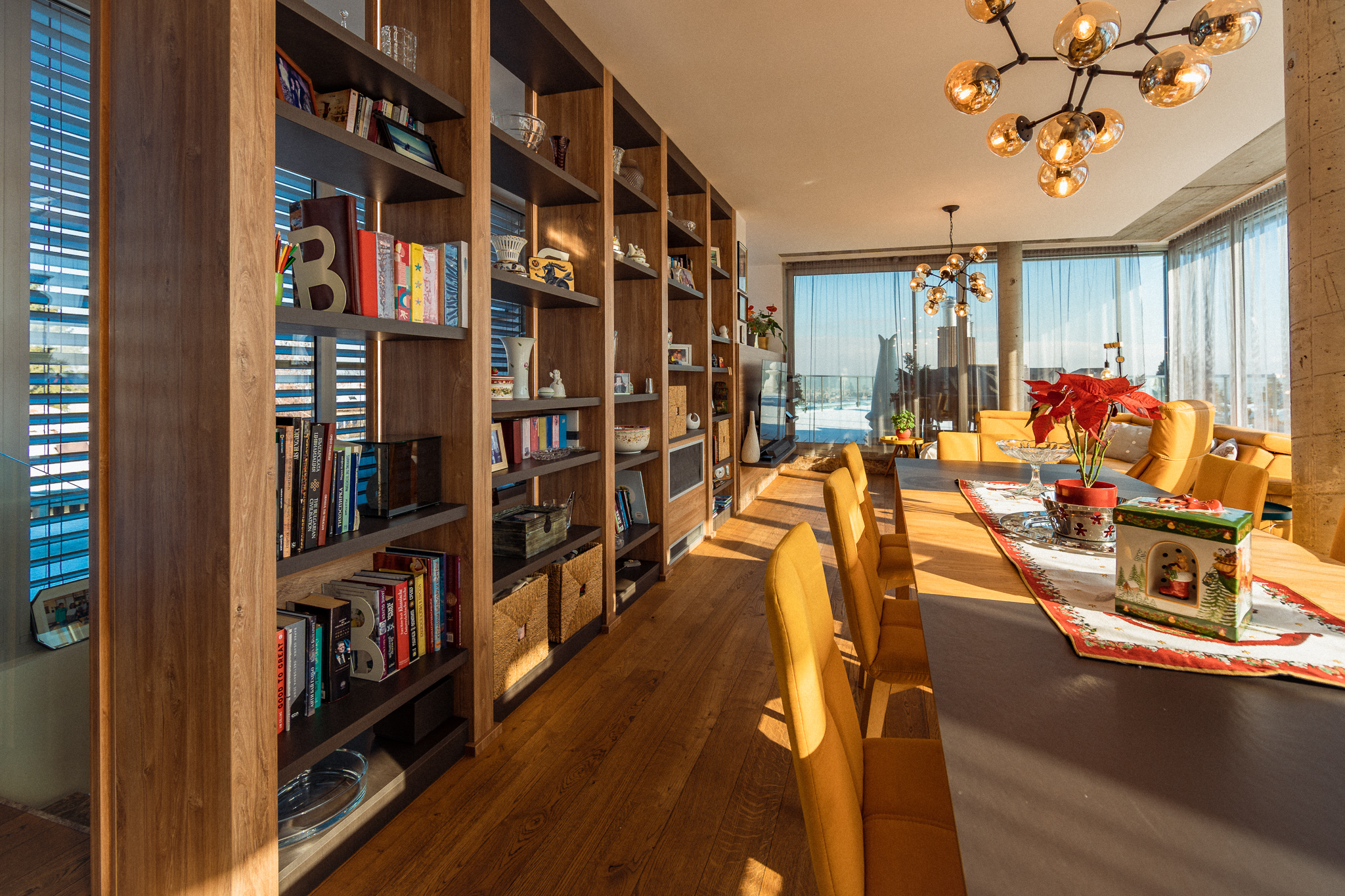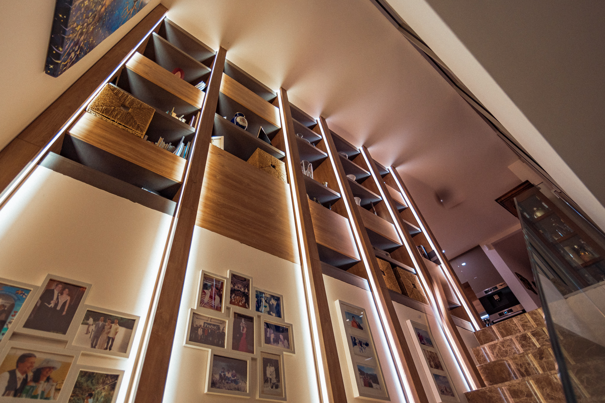 Библиотеката определено се оказа предизвикателство. Има функцията на парапет, допълнително осветително тяло за стълбите, поради специфичните нужди на един от собствениците, крие в себе си климатик, както и основното електро трасе на мезонета. Преминава плавно в ТВ стена и допълва безпроблемно заложените в интериора декори. Библиотеката дава на клиентите ни така нужното пространство за складиране на джунджуриите без които не можем.