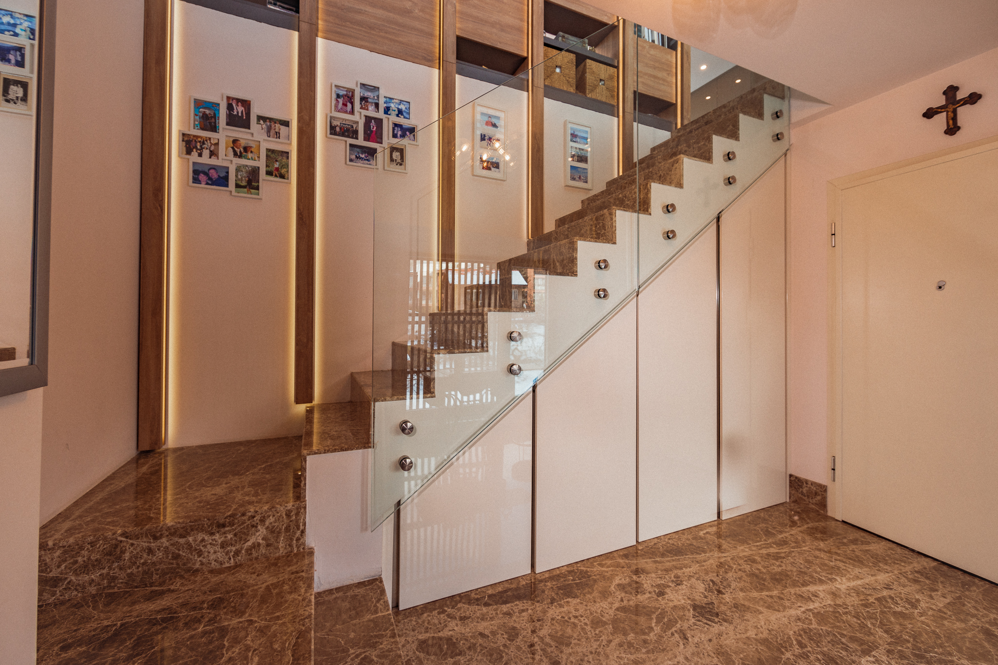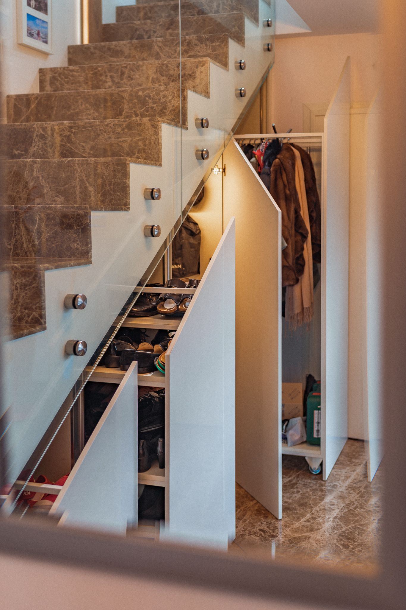 Специално за този проект създадохме механизъм, за изтеглящи се гардероб и шкафове за обувки под стълбата. Стандартните механизми позволяват до 60 см отваряне, докато апартаментът разполага със 100 см ниша под стълбата. Както за нас, така и за клиентите ни загубата на всяко пространство е немислима, поради което създадохме проста но функционална система за оползотворяване на 100% от наличното пространство.